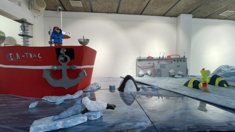 El primer repte, a l’hora de traslladar les figures i els elements d’aquest entorn, ha estat l’escala: a quin tamany reproduir-los i com treballar-ho a l’aula? La tridimensionalitat i el volum, en relació amb models reals —foques, pingüins, inuits, vaixells, etc.—, són difícils de concebre i representar per als infants d’aquesta edat. Per això hem utilitzat siluetes negres de fusta creades expressament, que ens han servit com a referència tant de la mida com de la relació entre els diferents elements. També hem aprofitat materials reciclats per partir d’una base que ja tingués volum.